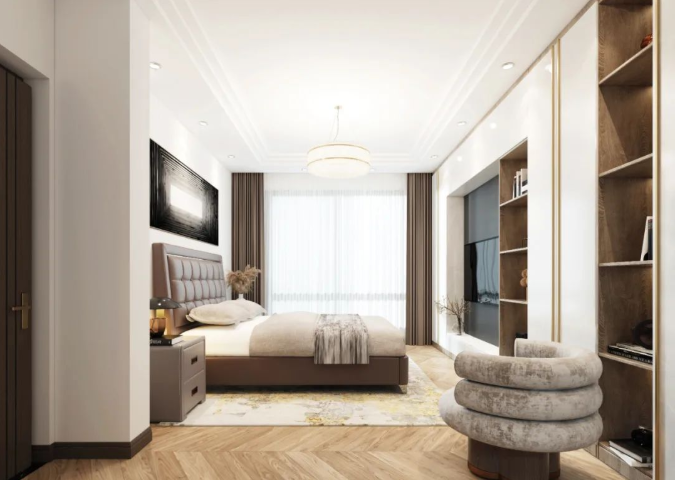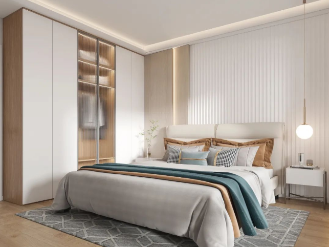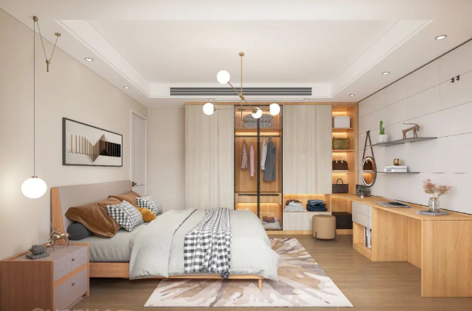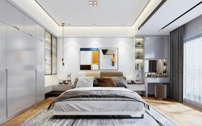 为了节约空间,设计师还会将衣柜和床头柜做一体设计,直接连接衣柜做悬空台面,睡前随手就能置放手机、眼镜等物品,视觉上更轻盈通透,也避免了卫生盲区,扫地机器人可以轻松出入。