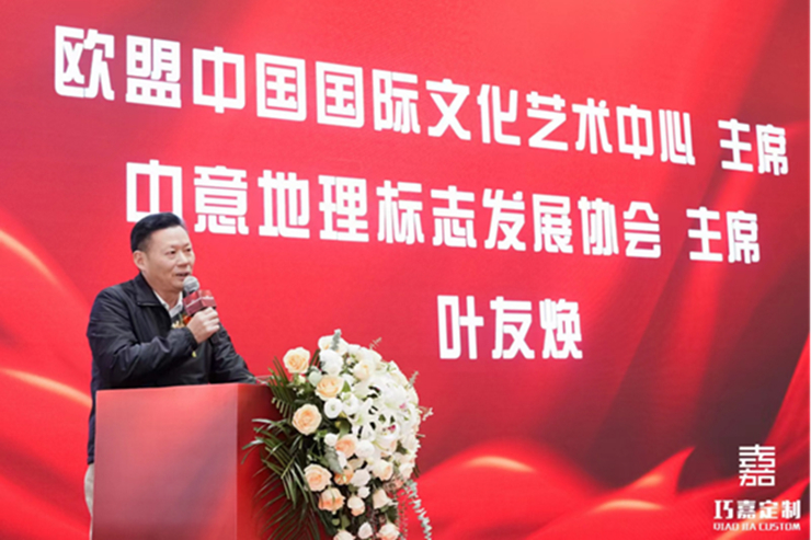 欧盟中国委员会(意大利委员会)主席,欧盟中国国际文化艺术中心主任,中意地理标志发展协会会长叶友焕先生上台发言,他表示:巧嘉是匠心独运的品牌,开业对装饰设计行业来说是喜讯。