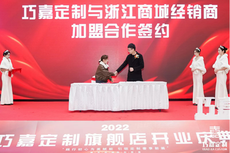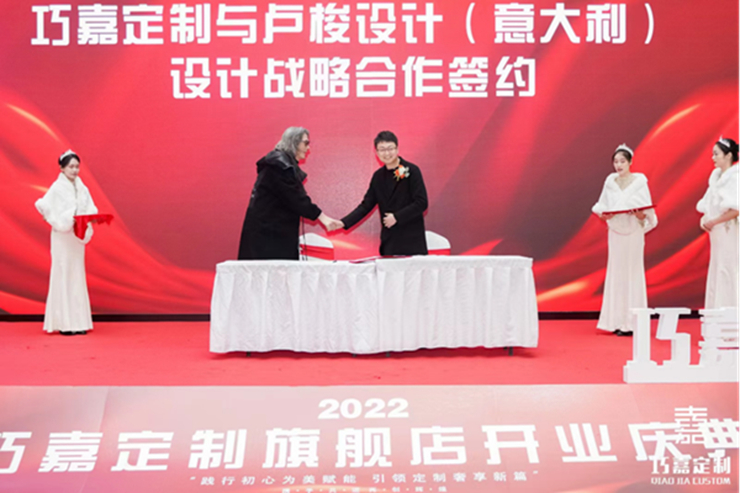 结束了激动人心的发言环节,在在场各位嘉宾见证下,贵州巧嘉木业科技有限公司董事长翁波先生代表巧嘉定制,签约了意大利设计师KEVIN为设计顾问,上海麟晖(进口橱柜衣柜)为贵州代理,并与经销商代表签署加盟合作协议。