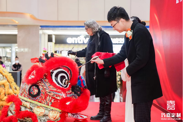 巧嘉木业科技有限公司董事长翁波先生和著名设计师鞠保国先生点画雄狮,雄狮舞动,可谓聚集祥瑞之气,福泽降临。随后,在场嘉宾移步四楼参加剪彩仪式并参观巧嘉旗舰店门店。